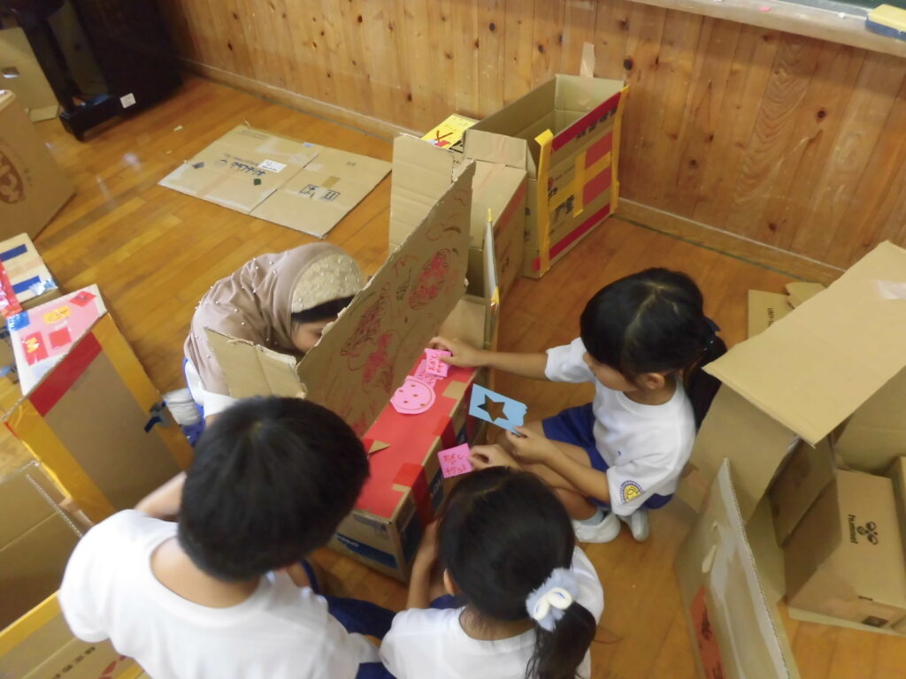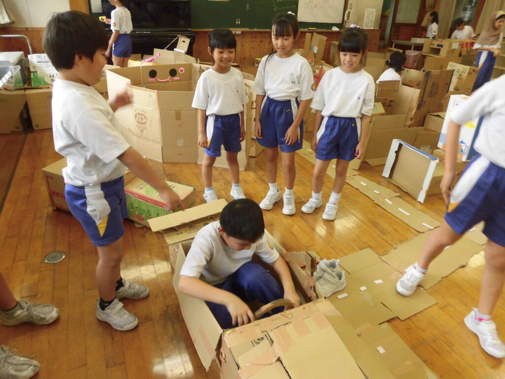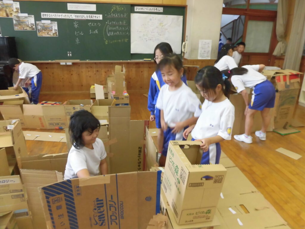 4年生は、図画工作科「ようこそ!ゆめのまちへ」の学習で、たくさんの段ボールを使って家やタワー、車、お店等をつくりました。完成した「ゆめのまち」に1・2年生を招待し、つくった物を紹介したり一緒に遊んだりしました。