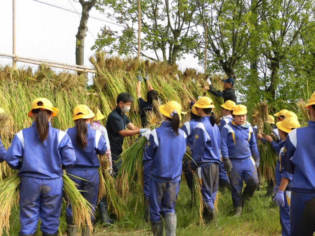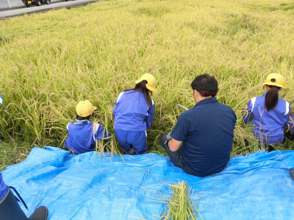 1学期に植えた苗が大きく育ち、地域の皆さんと一緒に稲刈りに挑戦しました。地域の皆さんに教えていただきながら、かまで刈ったり稲架掛け(はさがけ)をしたりしました。収穫したお米を食べるのが楽しみです。