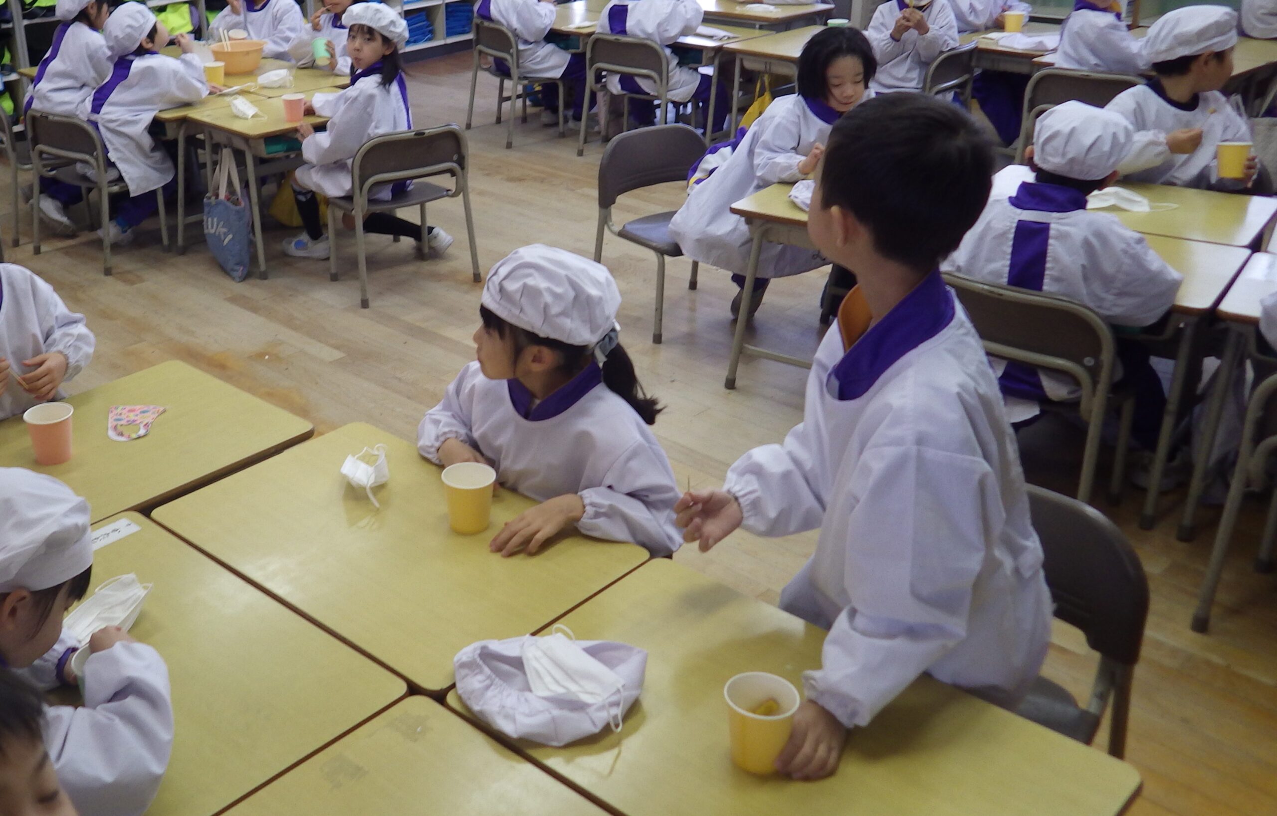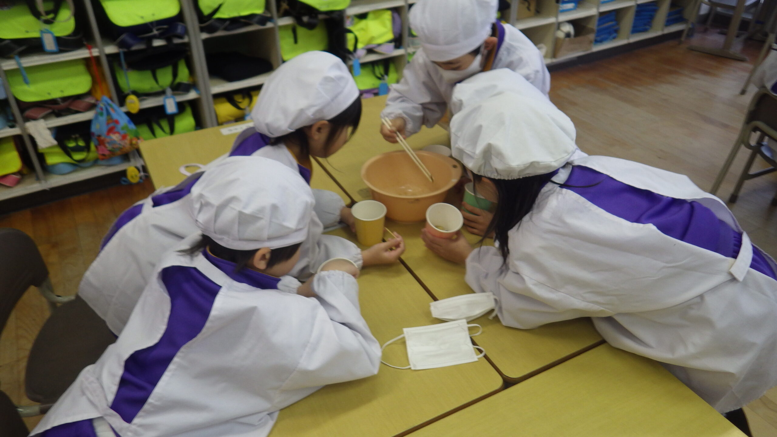 収穫したサツマイモで、大学芋を作りました。出来上がった後、みんなで分けるときは、「みんな同じぐらいの量になるようにしよう」と、仲よく楽しく食べることができるように工夫をしていました。食べているときは、「とてもおいしい」や「来年もがんばって育てたいな」という声が聞かれました。