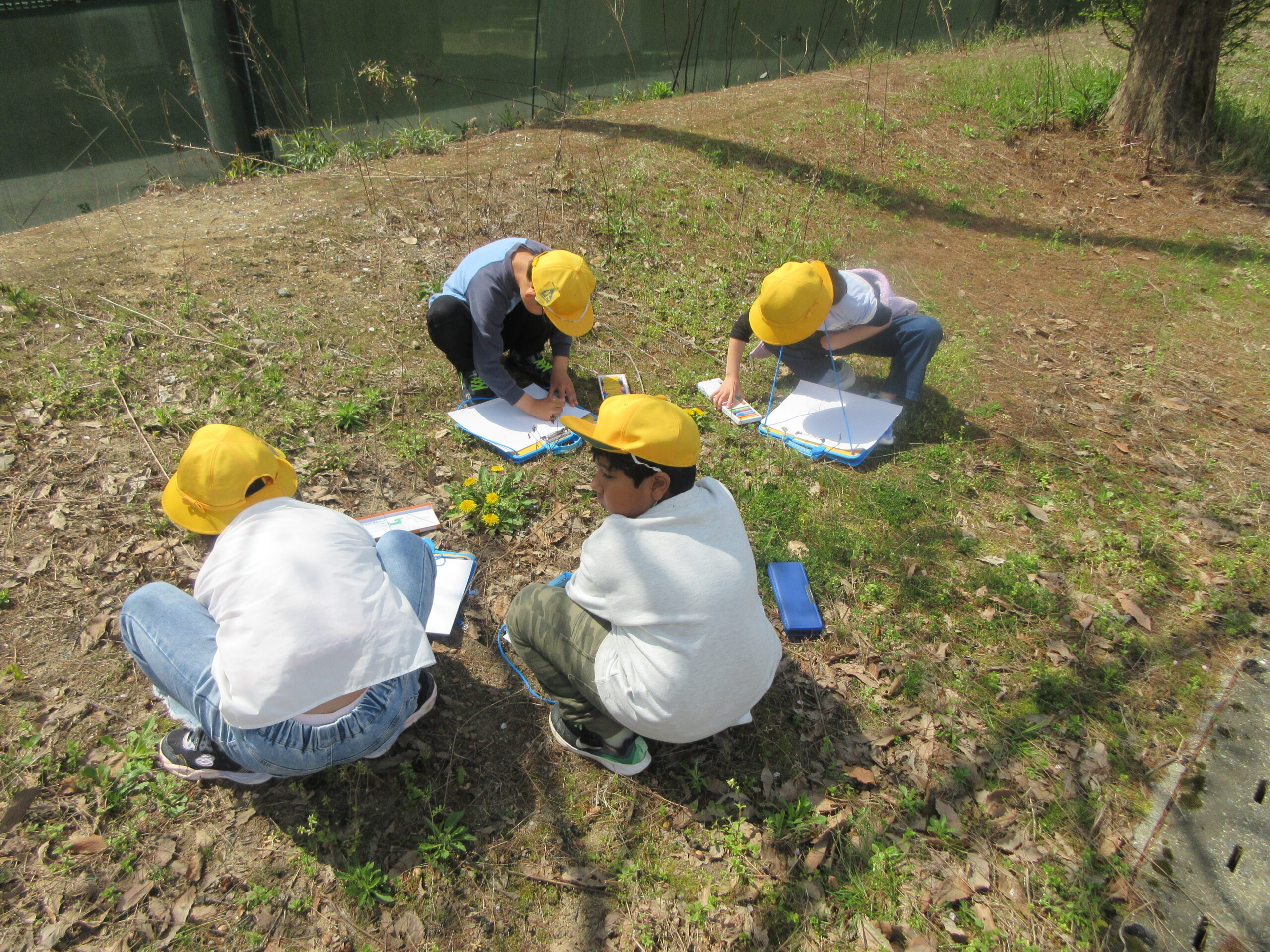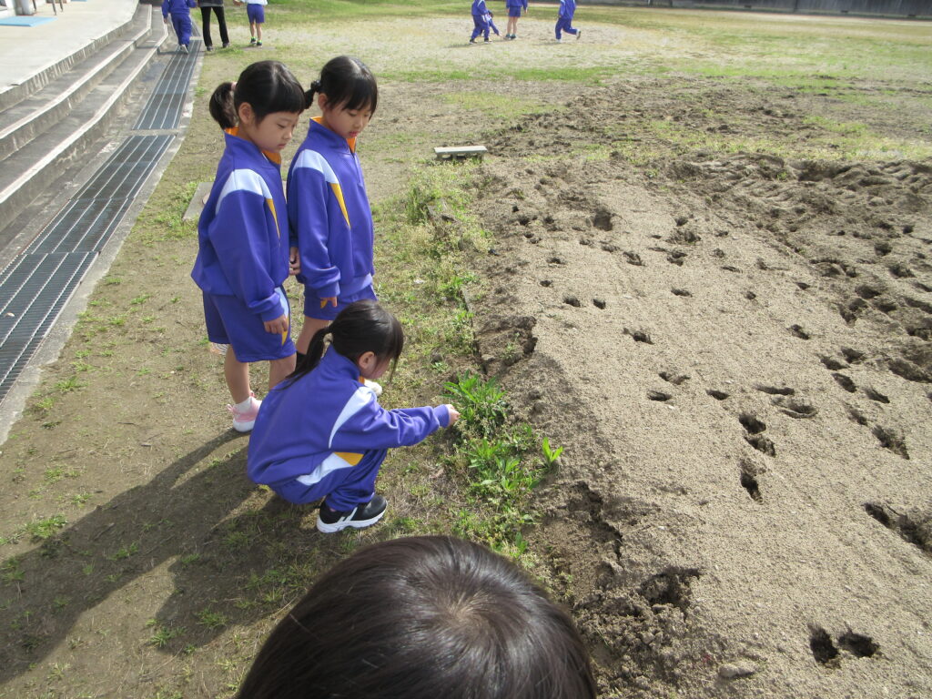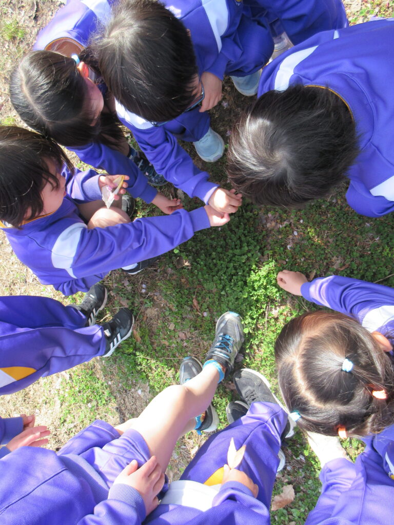 グラウンドでは、桜の花びら、タンポポ、カラスノエンドウ、ヒメオドリコソウ、シロツメクサなどを見つけました。触ってみたり、匂いを嗅いだり、色を見たりして五感で春を味わいました。