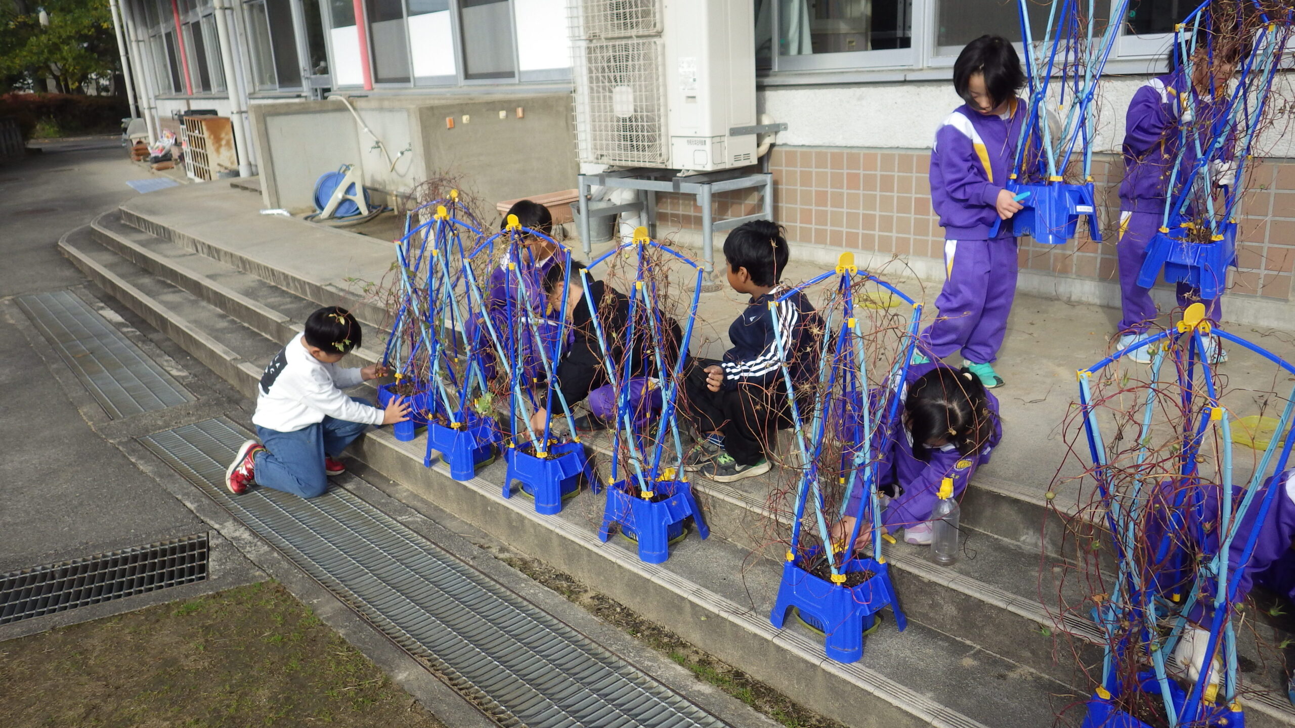 種から植え、夏休み中も家庭で一生懸命育てたあさがおを、「いつまでも残しておきたい」という思いをもち、あさがおのリースを作りました。絡まったつるを解いたり、まとめて輪にしたりする作業は大変でしたが、友達と協力して一生懸命作りました。最後は、色とりどりの飾りをつけて、みんなで完成を喜びました。