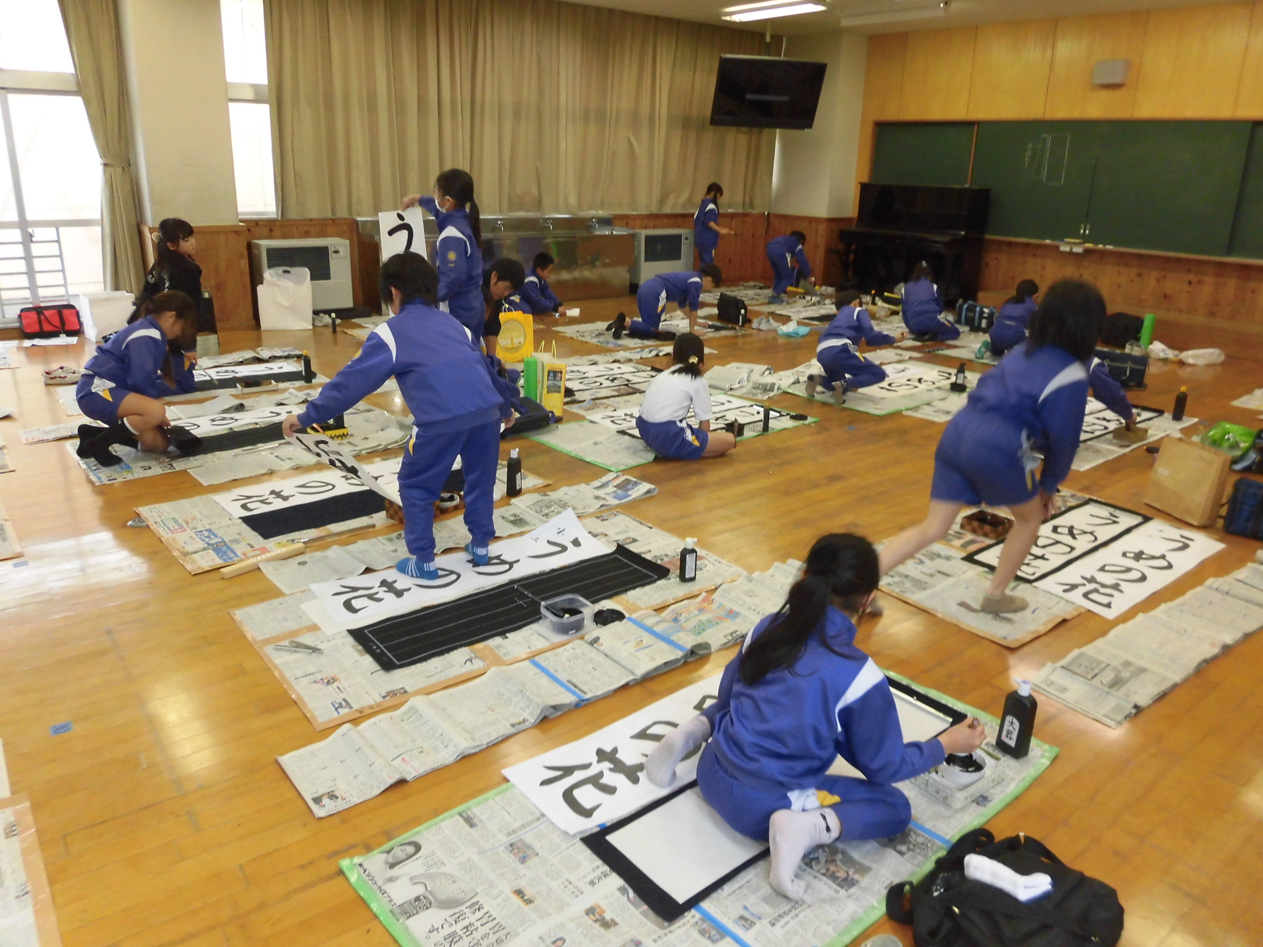 1月8日始業式の日に校内書初大会が行われます。それに向けて、3年生では初めてのだるま筆での毛筆練習を始めました。半紙に書くときと文字の太さや大きさが異なります。床で書くというのも初めてなので難しいです。1枚目は弱々しい字でしたが、何枚か書くうちに、太く書けるようになってきました。繰り返し練習をして、上達していく姿が楽しみです。