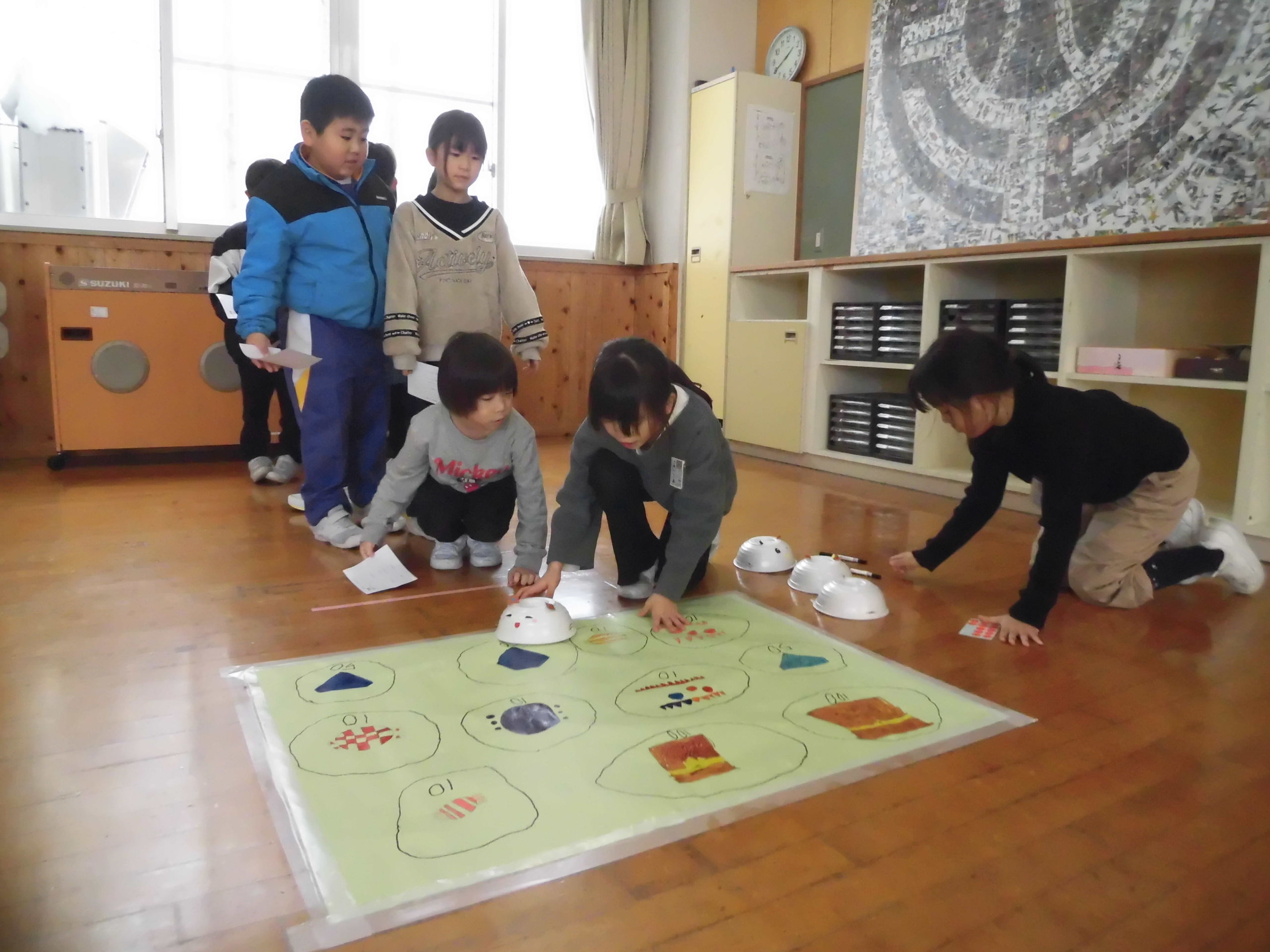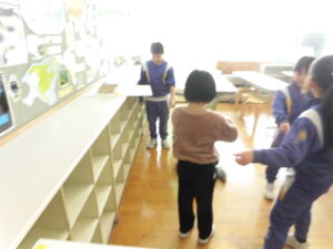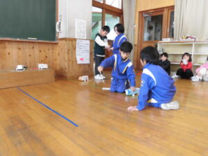 2年生は、生活科の学習で、身近なものを材料にしていろいろなおもちゃをつくりました。学習の最後には、1年生を招待して、自分たちがつくったおもちゃで遊んでもらいました。