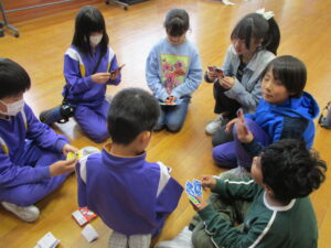 6年生の卒業が近付いてきました。なかよし班での1年間の最後の思い出づくりとして、班遊びを行いました。鬼ごっこやハンカチ落とし、トランプやカルタ等、みんなで遊び、楽しい時間を過ごすことができました。