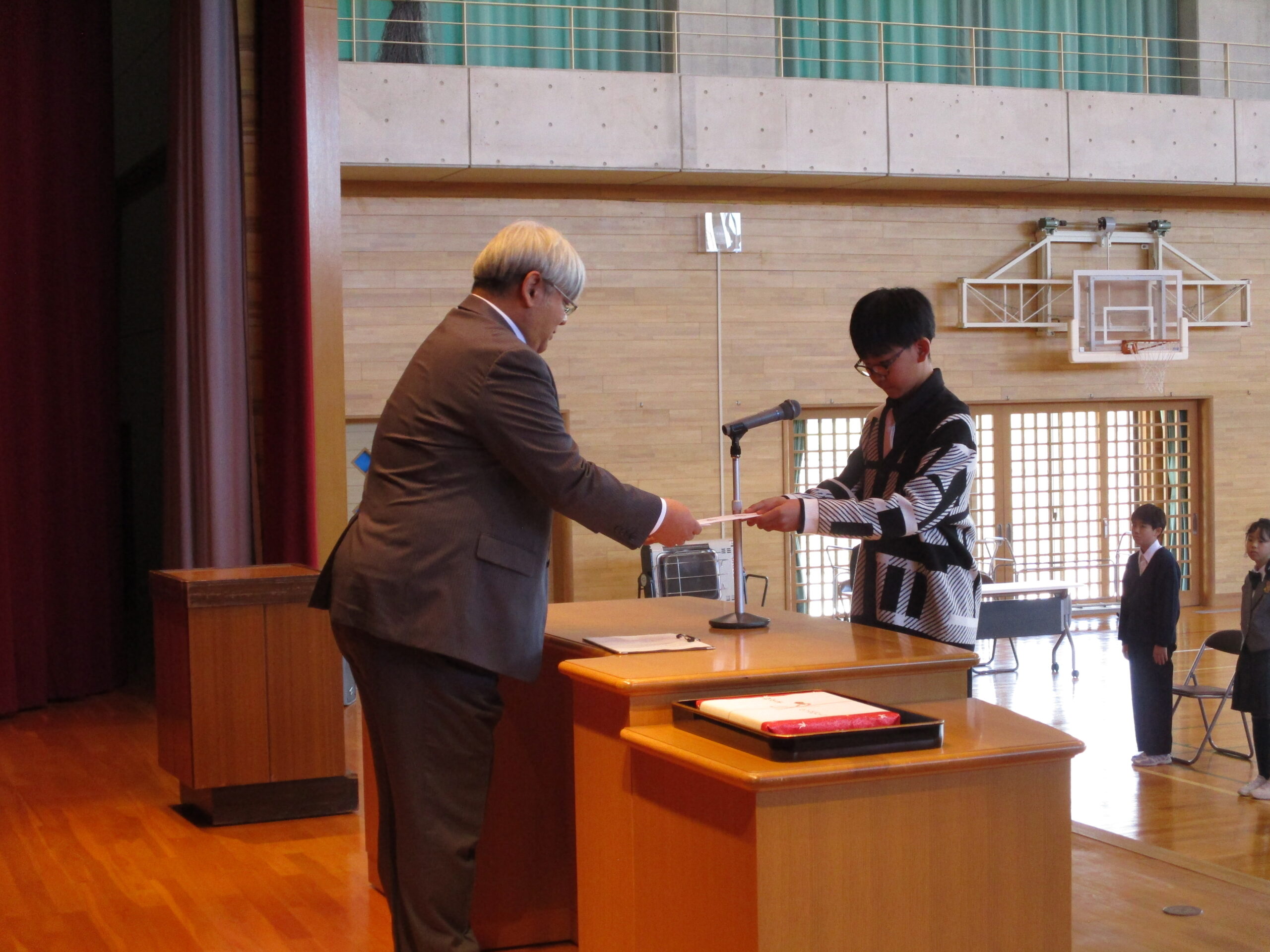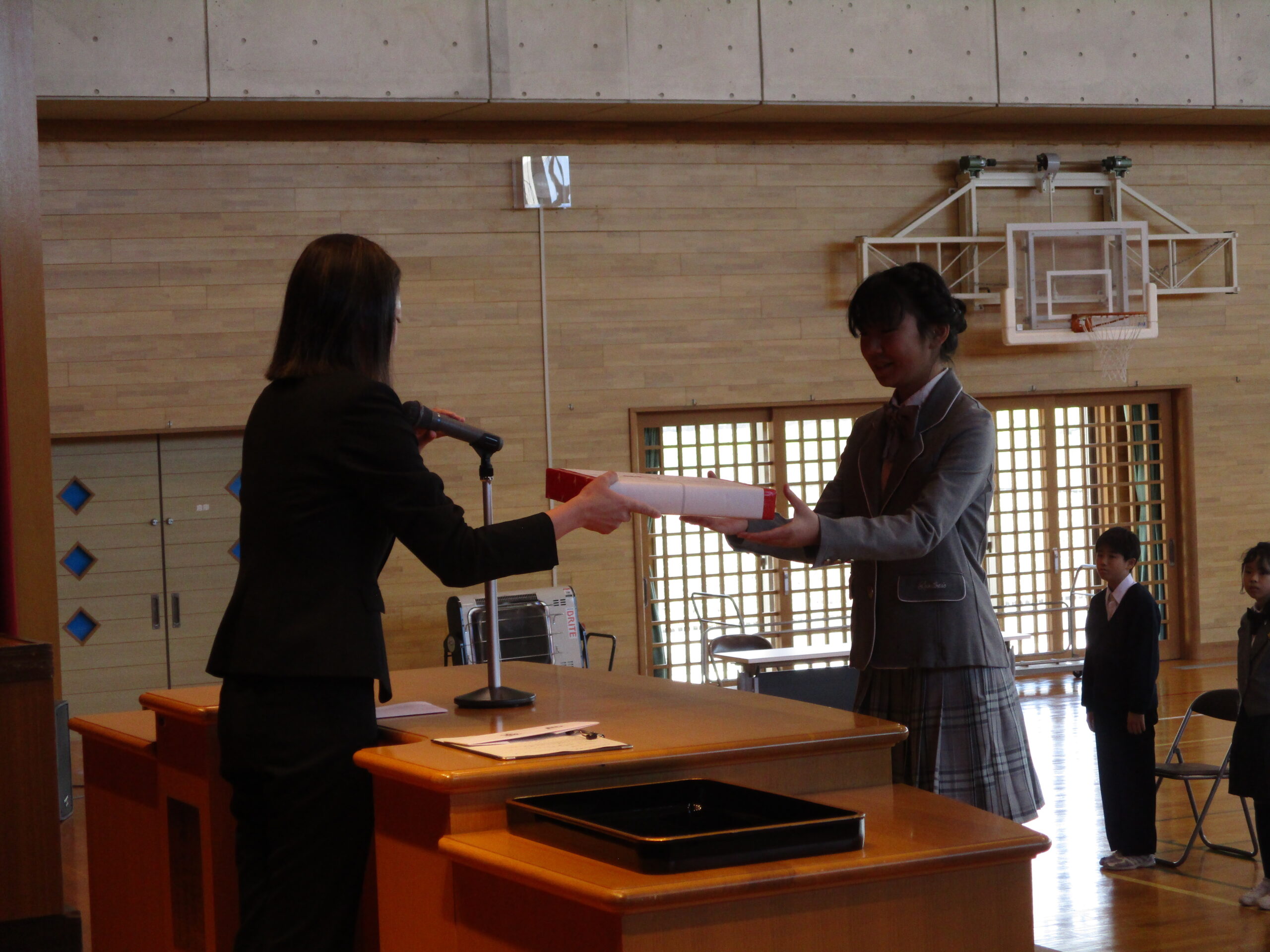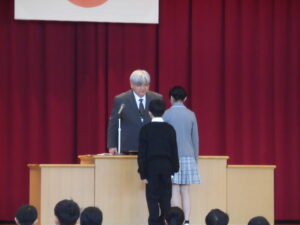 卒業証書授与式の予行演習の後、卒業記念品目録贈呈式とPTA卒業記念品授与式を執り行いました。卒業生の皆さんからは、高学年の学習で使用する電動糸のこぎりをいただきました。PTAからは、卒業証書ホルダー等を卒業生に贈られました。また、6年間休まずに登校した2名の児童に、皆勤賞が贈られました。