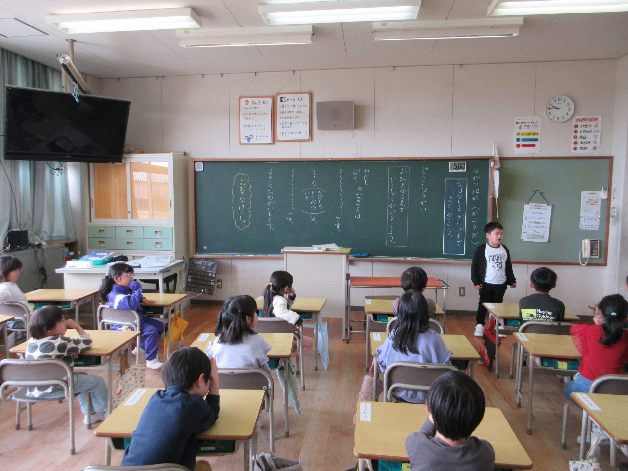 本番では、全員が大きな声で堂々と自己紹介をすることができました。また、友達の発表のときには静かに聞き、大きな拍手を送っていました。