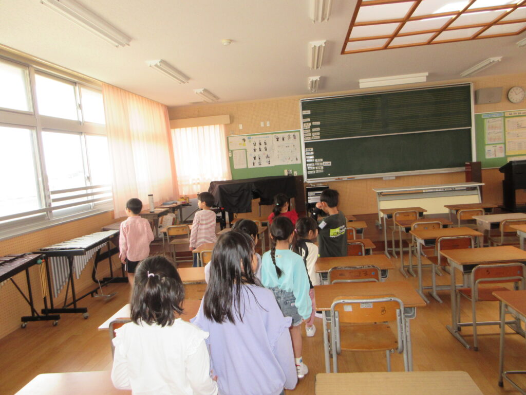 子供たちは、「音楽室にはたくさんの楽器があるよ」「図書室にはいっぱい本があった」「職員室では先生がお仕事をしているよ」などと、多くの発見をしていました。