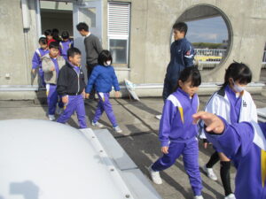 11月19日(水)、地震や津波を想定した避難訓練を行いました。津波の際は、高いところに避難する必要があります。普段上がることのない屋上にどのように避難するのかを確かめました。今回は、片口保育園、園児の保護者の方、地域の方と合同で訓練を行いました。子供たちだけでなく、教職員もどのように対応していく必要があるか、全体で確かめることができました。