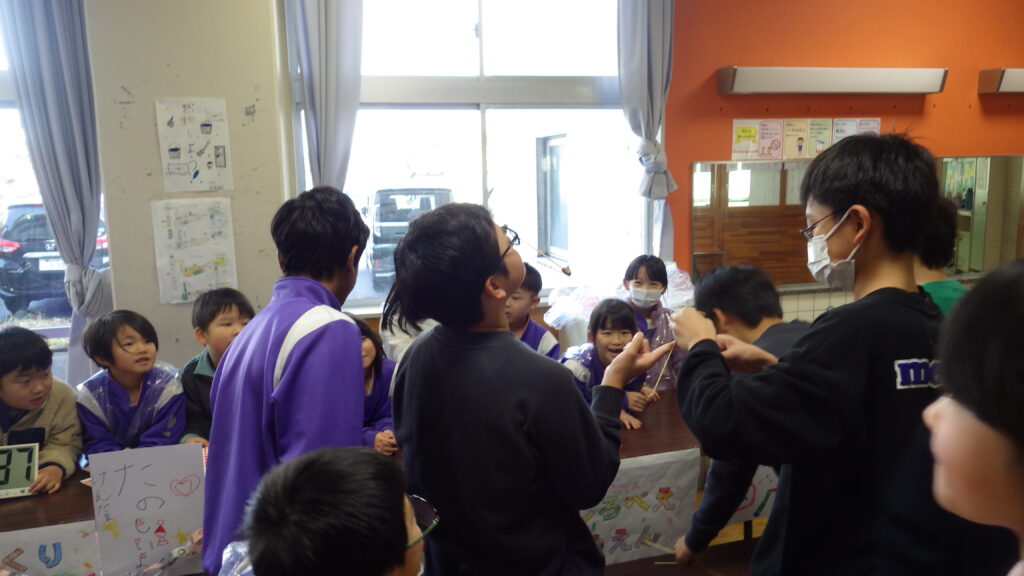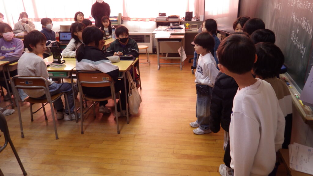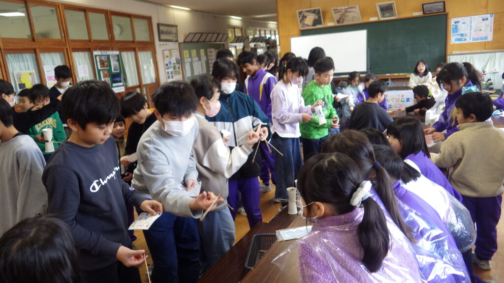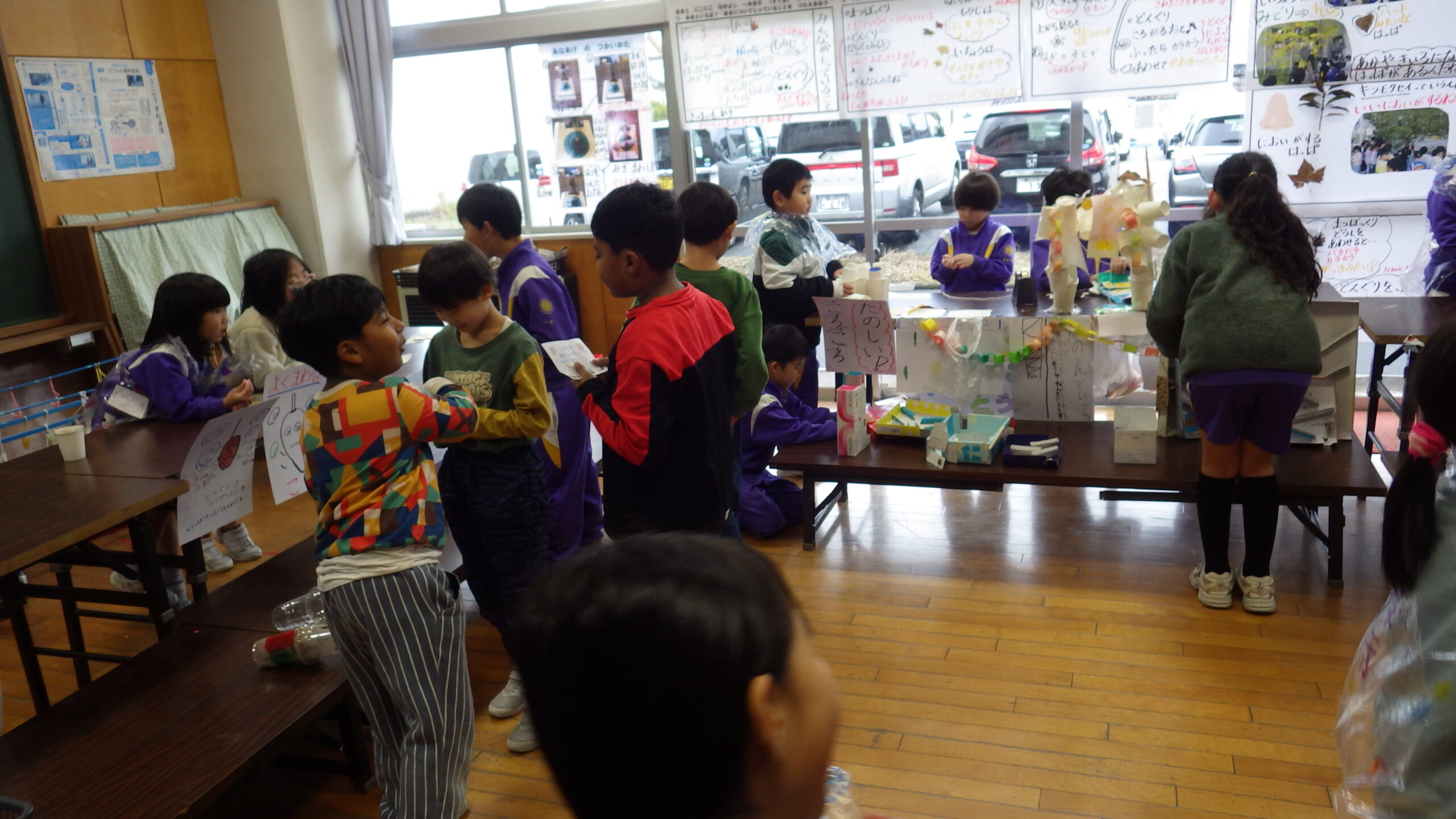 生活科で見付けた秋の「すてき」でつくったおもちゃを集めて、「あきランド」を開園しました。そこで、子供たちは「2年生から6年生のみんなに来てほしい」と考え、12月17日~20日の3日間限定で全学年をあきランドに招待しました。どの学年もたくさんの人が足を運んでくれました。振り返りでは「お客さんがいっぱい来てくれて嬉しかった」や「楽しそうにしていてぼくもうれしかった」と活動の達成感を感じました。自分だけではなく、周りの人に楽しんでもらうことに幸せを感じることができた、よい機会となりました。