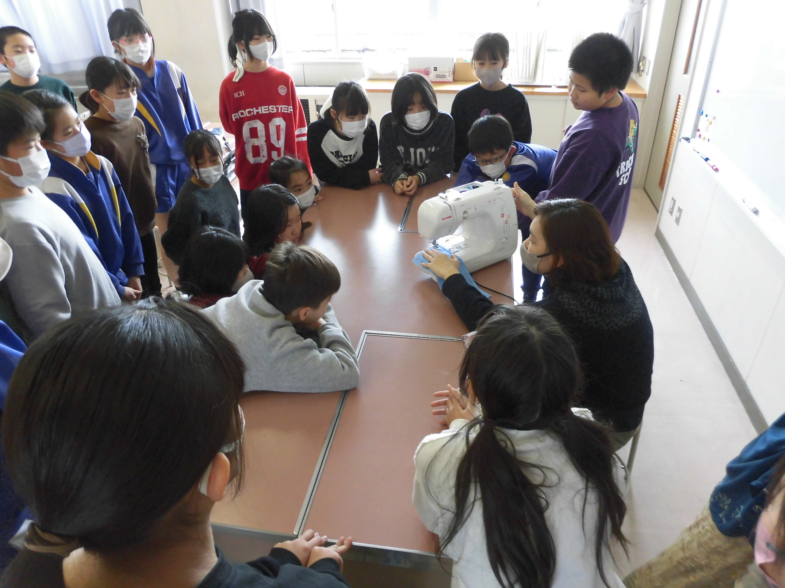 5年生の家庭科では、1学期に裁縫セットを使って手縫いを経験しました。3学期は、ミシン縫いに挑戦です。方向の変え方や返し縫いの仕方等、ミシンの基本的な使い方を練習しています。練習の後は、エプロンを作り始めます。